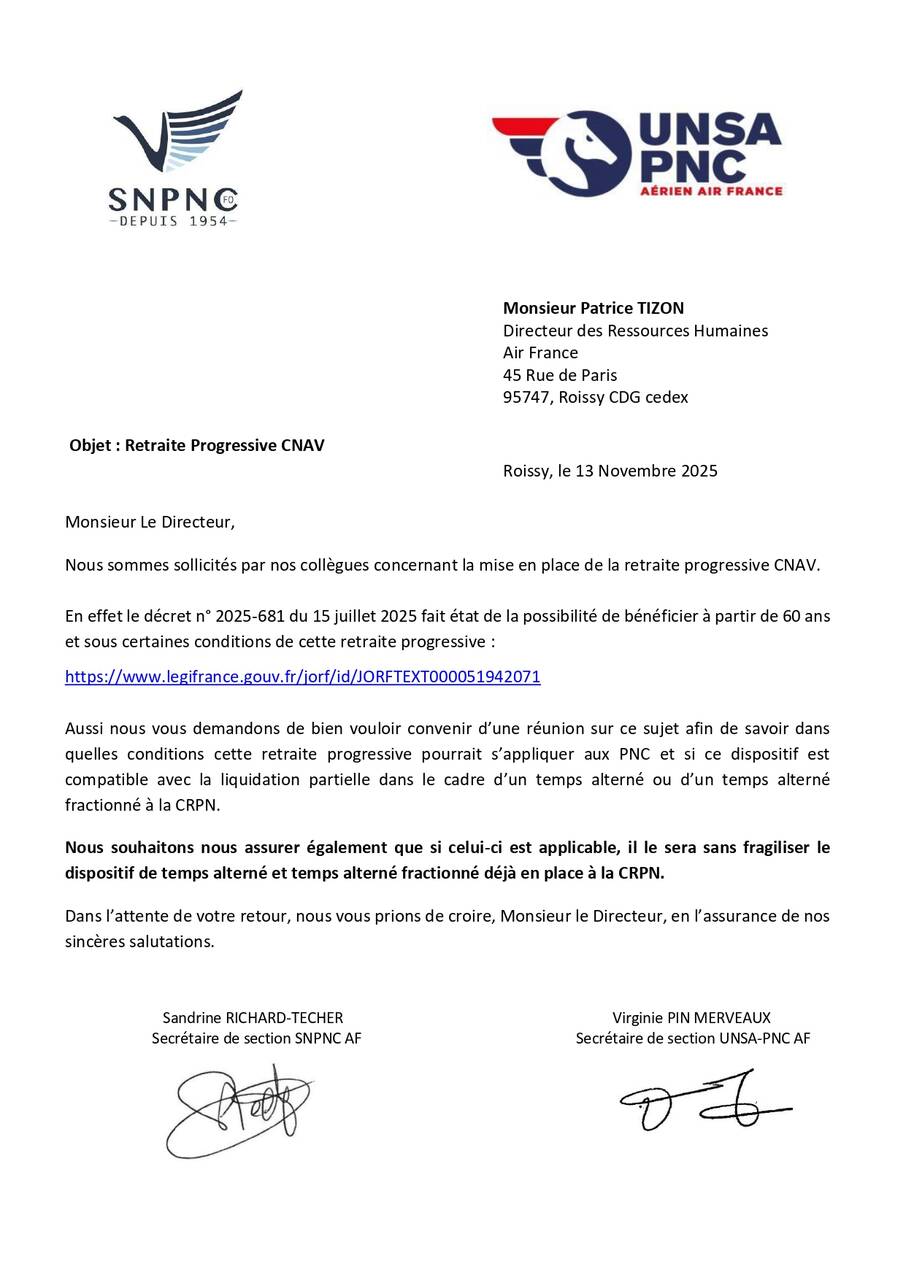Ainsi, nous demandons, dès à présent, à notre Direction, de mettre en place les process nécessaires, permettant aux PNC réduisant leur activité en fin de carrière, de bénéficier techniquement de la part de la Caisse nationale de l’assurance vieillesse, d’une partie de leur pension de retraite de base.