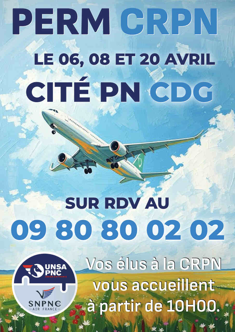 En Avril vos élus UNSA/SNPNC à la CRPN vous recevrons dans les bureaux de l’UNSA PNC au 2ème étage ascenseurs rouges de la cité PN à CDG :